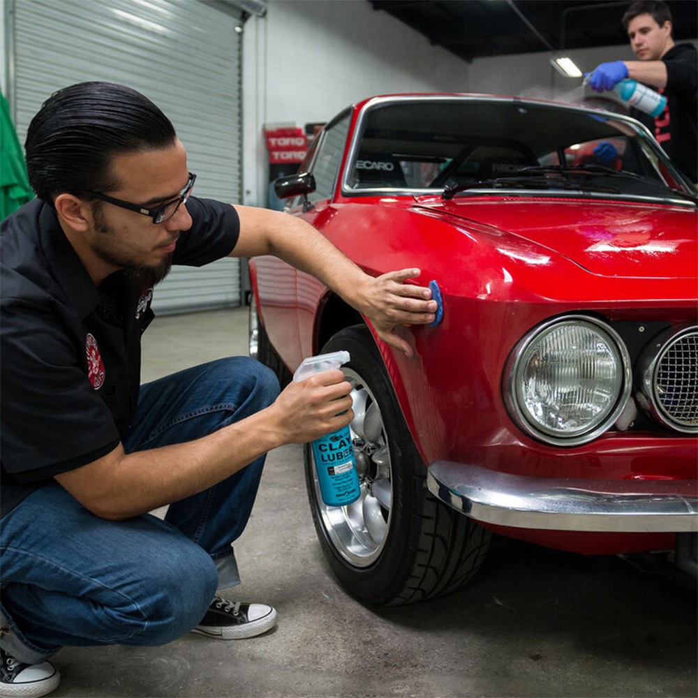Det kan kännas lite underligt till en början att dra lera på den känsliga lacken men snabbt förstår man hur fantastiskt ren ytan blir, helt fri från de mest envisa föroreningar. Lera behöver smörjning vid användning så använd alltid Clay luber från Chemical Guys.